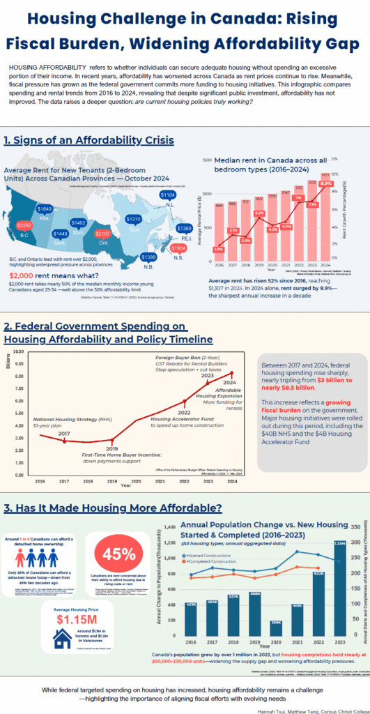 Hannah and Matthew’s project focused on housing affordability challenges in Canada. In their infographic, they identify rising average rent over time and how average rents vary across Canada. They also highlight several ways in which the federal government has increased spending on various affordability initiatives in response. Despite that increase in targeted spending, however, they illustrate how affordability remains a challenge.